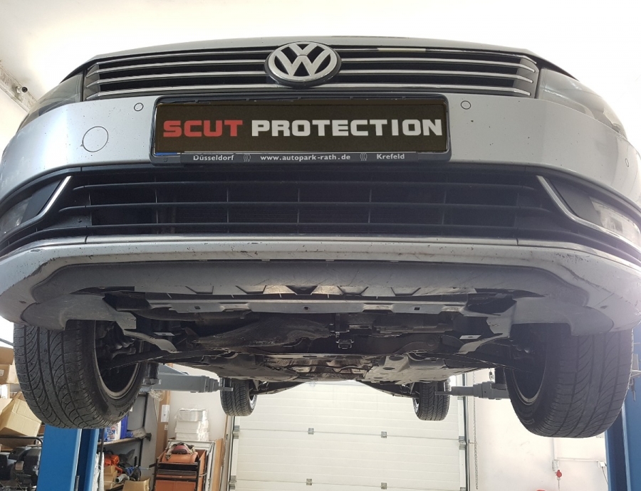 Pe de alta parte Passat-ul alltrack 2013 are din fabrica o consola traversa in partea din fata insa datorita faptului ca scutul original este mai gros la Alltrack decat la varianta de serie si in zona respectiva exista o intaritura din plastic de aprox. 1-1.5cm, scutul dvs. nu ajunge la respectiva consola, dupa abandonarea variantei cu consolele dvs. au trebuit facute trei gauri in scut in pozitiile originale si sudate distantiere din teava pentru a putea fixa scutul pe consola originala.